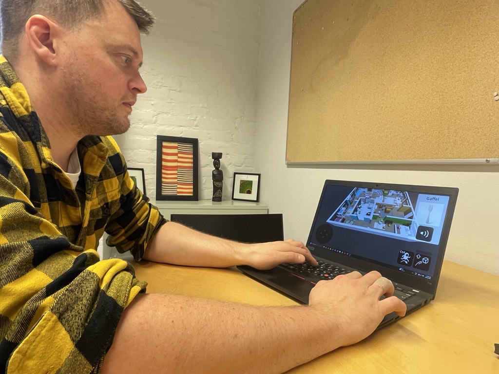 En annan brist i systemet är att nuvarande digitala resurser riktar sig främst till barn, och fungerar dåligt för vuxna inlärare. Acquah vänder skärmen på sin laptop och visar några bilder från ett spel. Vi ska återkomma till det strax.